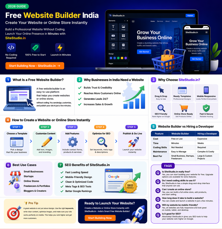 Creating a website no longer requires technical expertise or high costs. With a free website builder in India like SiteStudio.in, you can build a professional website or online store instantly.